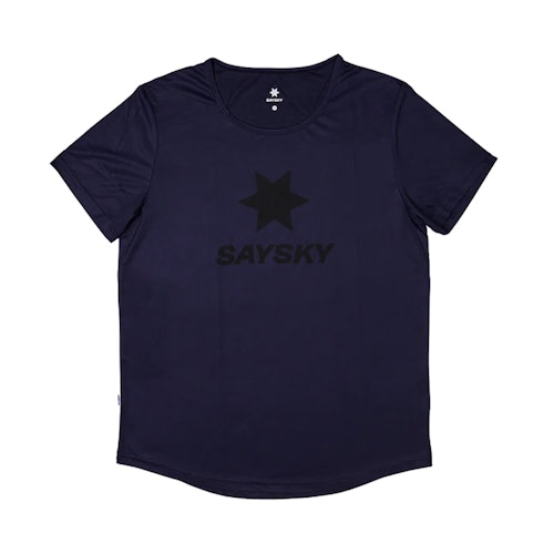 The Logo Flow T-shirt is a comfortable shirt with short sleeves. The t-shirt feels soft against the skin and has a black SAYSKY logo on the front and a white woven SAYSKY label on the back.