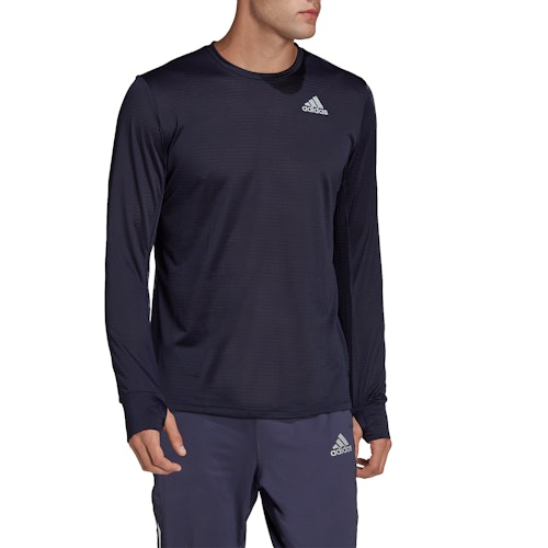 La chemise Own The Run est une chemise de course à manches longues. La matière Climacool offre une ventilation optimale et évacue efficacement l'humidité. Le matériau recyclé est doux sur la peau et offre une liberté de mouvement optimale. Les trous pour les pouces dans les manches maintiennent le maillot en place pendant la course.