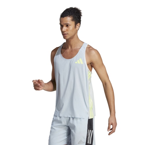 Le Promo Singlet est un maillot de course sans manches confortable. Le débardeur est équipé de la technologie Aeroready, qui régule l'humidité pour vous procurer une sensation sèche et confortable. De plus, l'ensemble du maillot est pourvu de trous perforés au laser pour une circulation d'air et une ventilation supplémentaires, ce qui le rend très adapté à votre course les jours les plus chauds. Partiellement fabriqué à partir de matériaux recyclés.