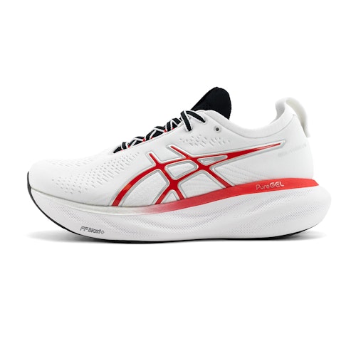 Référence: 1011B750-100 Type de produit: Chaussures de running polyvalentes Collections: ASICS Gel Nimbus Couleur: Blanc Genre: Homme Marque: ASICS Type de chaussure: Neutre Amorti: Modéré / maximal Hauteur avant-pied: 33,5 mm Hauteur talon: 41,5 mm Drop: 8 mm Réactivité: Faible / modérée Maintien: Moyen Poids: 298 g Largeur: Normal