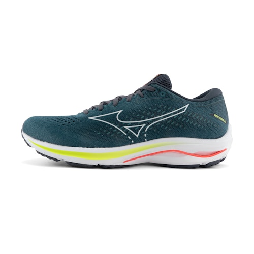 La célèbre Mizuno Wave Plate se retrouve également dans la Wave Rider 25. Cette plaque en plastique a la forme d'une vague. Cette forme de vague permet un atterrissage stable et une plus grande résilience pendant la course. La plaque à vagues du Rider 25 est légèrement renforcée à l'intérieur. Pendant la course, en cas de fatigue, cela donne une sensation légèrement plus stable. Cela rend la marche un peu plus facile. Contrairement à la Wave Rider 24, la semelle intermédiaire de la Rider 25 est entièrement constituée de matériau amortissant Enerzy. Ce matériau est plus souple que le matériau de rembourrage utilisé auparavant. Il est également 15% plus résilient, pour une sensation de course plus légère.