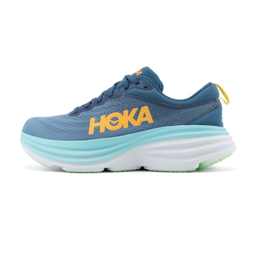 Die Außensohle besteht aus Zonengummi und hat ein grobes Profil für guten Halt auf jedem Untergrund. Für eine verbesserte Haltbarkeit wurden Zonen aus abriebfestem Gummi an Ferse und Vorfuß hinzugefügt. Die Geometrie der Außensohle ist so konzipiert, dass sie Eigenstabilität und einen effizienten Schritt gewährleistet. Holen Sie mit dem HOKA Bondi 8 das Beste aus Ihrem Lauf heraus! -