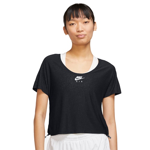 Das Nike Air Dri-FIT T-Shirt für Damen ist ein Kurzarm-Laufshirt. Das Shirt fühlt sich angenehm weich und leicht an. Das Oberteil punktet mit der Dri-FIT-Technologie von Nike, die Transpiration von der Haut zur Außenseite des Oberteils leitet, wo sie dann verdunsten kann. So bleibst du während deines Laufs angenehm trocken. Die Materialkombination mit Knit-Material sorgt für ein geschmeidiges Tragegefühl. Praktisch: Dank des Kordelzuges am unteren Rücken lässt sich die Länge des Oberteils anpassen.