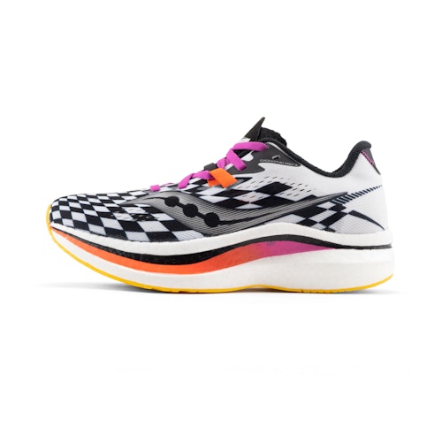 Der Saucony Endorphin Pro 2 für Damen ist ein schneller Wettkampf-Laufschuh, der mit recycelten Materialien punktet. Diese leichten Laufschuhe verfügen in der Zwischensohle über eine Carbonplatte. Die Platte bietet eine Extraportion Reaktionsfähigkeit und beugt Energieverlust vor. Dadurch fühlen sich deine Beine nicht so schnell müde an.