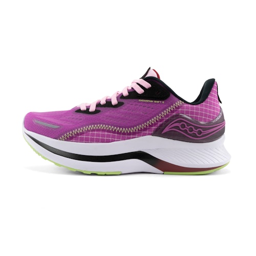 Der Saucony Endorphin Shift 2 für Damen ist ein komfortabler Allround-Laufschuh. Der Shift 2 eignet sich für deinen täglichen Run und wurde aus recycelten Materialien hergestellt. Das FORMFIT-Obermaterial ist leicht und schmiegt sich angenehm an deine Füße. Reibungen, Irritationen und Druckpunkte gehören der Vergangenheit an. Die Fersenkappe ist an der Außenseite mit einer Kunststoffschicht verstärkt. Zusammen mit der verstärkenden Stickerei auf dem Mittelfuß sorgt dies für eine Extraportion Stabilität.