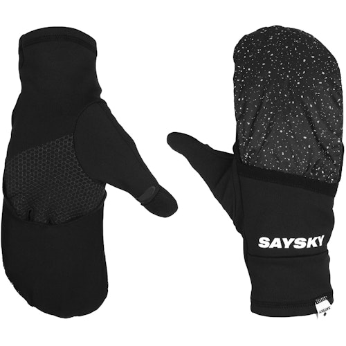 Die Blaze Gloves sind ein Paar warme Handschuhe für Männer und Frauen. Die Handschuhe haben ein weißes SAYSKY-Logo auf beiden Handschuhen und einen Fäustling mit einem reflektierenden Universumsdruck zum Schutz vor Wind und Regen. Die Handschuhe sind Touchscreen-freundlich, haben ein Daumenloch und einen rutschfesten Griff.