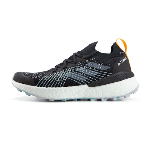 Adidas Terrex Two Ultra Parley för kvinnor är neutrala spårskor. Primeblue materialöverdel är tillverkad av Parley Ocean Plastic. Detta starka material tål påverkan av stenar, stenar och pinnar på dina spår. TPU-förstärkningarna på mittfoten ger extra stabilitet. Den övre är gjord av ett enda stycke, varför skonens tunga inte glider ner i skon eller blir irritation på andra sätt. Det garanterar också en mycket bekväm, nästan strumpliknande passform. Öglorna fram och bak gör det mycket enkelt att ta på och ta av skorna.