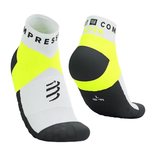 Om du letar efter rätt löparstrumpor för dina terrängaktiviteter, letar du efter Ultra Trail Low Socks från Compressport! Dessa strumpor ger stabilitet, dämpning och friskhet för dina fötter under dina trail-runs. Den förstärkta tåboxen i frotté skyddar dina tår och naglar under branta nedförsbackar och de tjocka frottébanden under fötterna och vid akillessenan absorberar stötar från terrängen och trycket från dina skor.