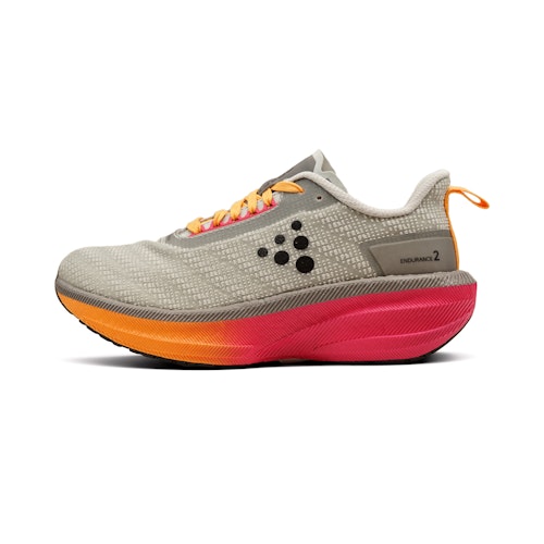 Ovandelen på Endurance 2 är gjord av mesh för god andningsförmåga. Skon har den så kallade Craft Regular Fit. Detta innebär att skon sitter tätt i hälen och mellanfoten med utmärkta inlåsningsmöjligheter och extra utrymme i framfoten för överlägsen komfort och prestanda.Bär sula