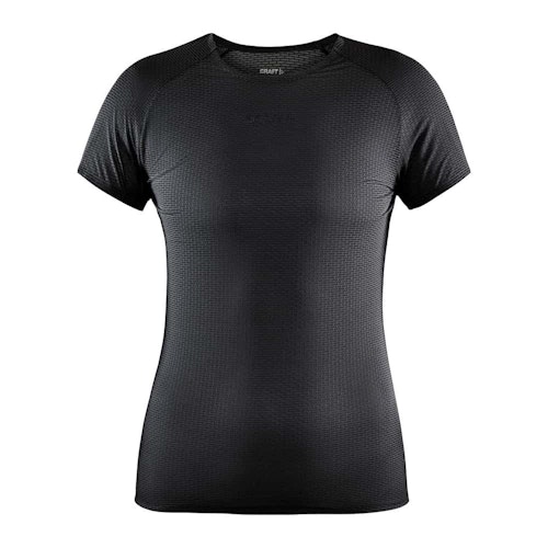 Craft Pro Dry Nanoweight T-shirt för kvinnor är en svalande topp med korta ärmar. Toppen erbjuder utmärkt ventilation och kyler huden effektivt vid körning under varmare förhållanden. Det innovativa Nanoweight Mesh-materialet uppmuntrar luftflödet mellan basskiktet och huden. Materialet leder också bort fukt och är väldigt lätt. Den kroppskramande passformen erbjuder mycket rörelsefrihet.
