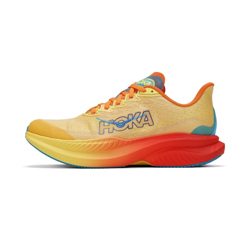 Yttersulan är gjord av durabrasionsgummi och har en grov profil för bra grepp på alla typer av underlag. Zoner av nötningsbeständigt gummi har lagts till hälen och framfoten för förbättrad hållbarhet. Geometrin på yttersulan är designad för att säkerställa inneboende stabilitet och ett effektivt steg. Sätt på HOKA Mach 6 och känn hur varje steg tar dig närmare mållinjen, med maximalt grepp, optimal dämpning och en lättvikts design. -