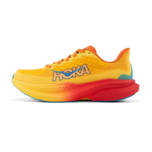 Den slitstarka Durabrasion-gummisulan med en grov profil ger utmärkt grepp på alla underlag. Zoner av nötningsbeständigt gummi har lagts till hälen och framfoten för extra hållbarhet. Geometrin på yttersulan är designad för att säkerställa inneboende stabilitet och ett effektivt steg. Du kommer att känna att varje steg tar dig närmare målet i HOKA Mach 6, med maximalt grepp, optimal dämpning och en lättvikts design. -