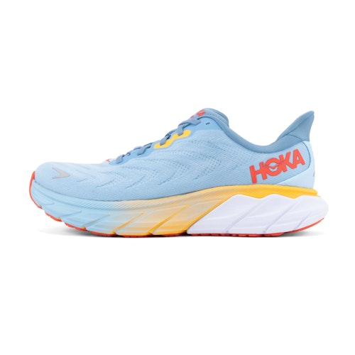 HOKA Arahi 6 (Wide) är överpronationsko. Denna sjätte version i Arahi-serien har designats för att ge mer dämpning samtidigt som vikten hålls till ett minimum. Detta skiljer Hoka från de traditionella överpronationsskor. Mesh ovandelen är lätt, ventilerar väl och ger bättre stöd. Mesh materialet på hälen ger också en extra stadig känsla.