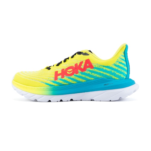 HOKA Mach 5 är neutrala löparskor. Teknikerna från Mach 4 och Mach Supersonic möts i denna lätta träningssko. Denna snabba sko från HOKA kallas även för "Carbon X" utan kolplåt.