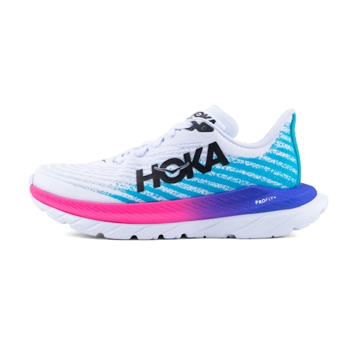 HOKA Mach 5 är neutrala löparskor. Teknikerna från Mach 4 och Mach Supersonic möts i denna lätta träningssko. Denna snabba sko från HOKA kallas även för "Carbon X" utan kolplåt.
