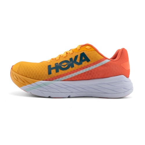 HOKA Rocket X för män och kvinnor är en neutral tävlingssko. Denna nyaste HOKA-modell kan ses som efterföljaren till Carbon Rocket och Carbon X-modellerna. Rocket X är en lättviktsracer som har designats speciellt för att springa korta sträckor med höga hastigheter. Vill du springa ditt snabbaste 10 km eller halvmaraton någonsin? Då är Carbon Rocket din favoritsko. Den mycket tunna ovandelen i mesh ger hög andningsförmåga och passar smidigt runt fötterna. Hälen och plösen har mer struktur än de flesta andra tävlingsskor. Tack vare denna extra struktur kommer du att uppleva mycket mer komfort samtidigt som du bara lägger till lite vikt. HOKA Rocket X väger bara 210 gram i amerikansk storlek 9.