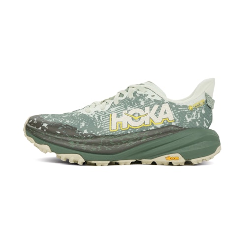 SKU: 1155150-SFRN Artikelgrupp: Trailskor Kollektioner: HOKA Speedgoat Färg: Grön Kön: Herr Märke: HOKA Skotyp: Neutral Dämpning: Måttlig / maximal Höjd framfot: 32 mm Hälhöjd: 37 mm Drop: 5 mm Lyhördhet: Måttlig Stöd: Måttligt Vikt: 301 g Specifikationer: Vattentät, GORE-TEX, Tåskydd, Vibram Längd på traildubbar: Hög (4,6 – 8 mm) Trailtyp: Teknisk trail, Mjuk underlag Bredd: Normal Vikt: 300+ gram Stack height: 30-40mm (Hög)