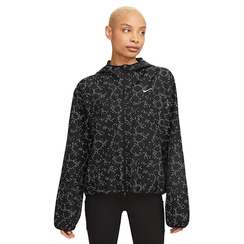 Dri-FIT Jacket är en bekväm löparjacka med huva. Jackan har ett reflextryck som är inspirerat av galaxen. Nike Dri-FIT-tekniken säkerställer god andningsförmåga, snabbare avdunstning och en bekväm passform.