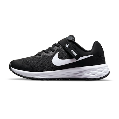 Nike Revolution 6 FlyEase är en mångsidig löparsko för barn. Tränarna är idealiska för en dag fylld med lek och sport. Nikes FlyEase-teknik gör det väldigt enkelt att ta på och av skorna. En dragkedja som går längs hälen öppnar skorna och ett band runt den övre delen av fötterna säkerställer en bra passform. Den lätta textilen säkerställer ventilation som hjälper fötterna att hålla sig fräscha. Överlägget vid hälen ger stöd och stabilitet för rörelse i olika riktningar. Mjukt skum under fötterna skapar mjuk dämpning med varje steg du tar. En yttersula i gummi ger grepp.
