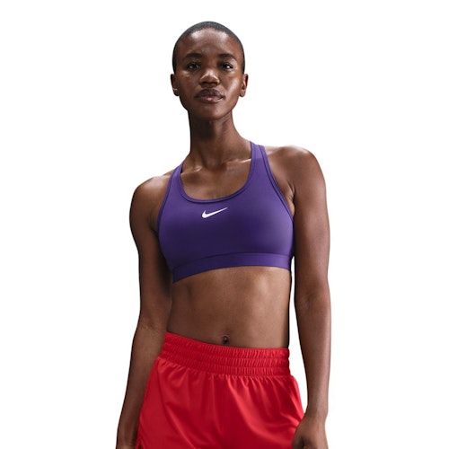 Denna sport-bh erbjuder medelhögt stöd och är gjord för sportaktiviteter som yoga, pilates och stretching. BH:n kan bäras under lätta löprundor om du har en liten kupstorlek, under mer intensiva löppass eller om du inte har en liten kupstorlek rekommenderas en high-impact-bh. Nike Swoosh Dri-FIT Medium Support Padded Sports BH ger bra stöd utan en instängd känsla. Fokusera på din träning utan att bli distraherad av överdriven svett. Nike Dri-FIT-tekniken transporterar effektivt bort överflödig svett för att bibehålla torr hud.