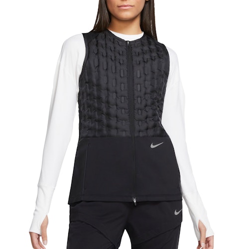 Nike Therma-Fit ADV Downfill Vest är en vattenavvisande kroppsvärmare för kvinnor. Tack vare vattenavvisande och värmereglerande material är bodywarmeren idealisk för kalla förhållanden. Bodywarmeren har Nikes Therma-Fit-teknik. Denna teknik använder kroppens temperatur för att hålla dig varm. Panelerna på framsidan och baksidan är vadderade för extra värme. Fickan med dragkedja gör att du säkert kan förvara dina väsentligheter.