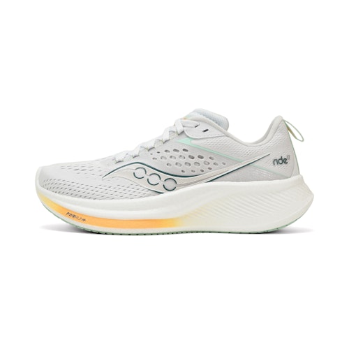 SKU: S10924-250 Artikelgrupp: Allround löparskor Kollektioner: Saucony Ride Färg: Vit Kön: Dam Märke: Saucony Skotyp: Neutral Dämpning: Måttlig Höjd framfot: 27 mm Hälhöjd: 35 mm Drop: 8 mm Lyhördhet: Måttlig Stöd: Måttligt Vikt: 238 g Bredd: Normal