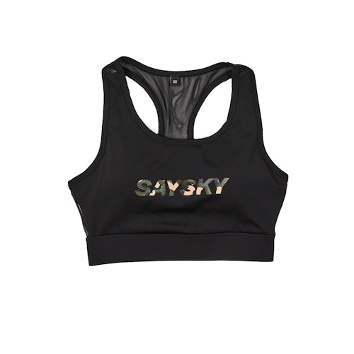 Combat Camo Sports Bra är en sport-bh med medium stöd med avtagbara kuddar. Den har en klassisk racerback av meshmaterial för en stretchig passform och maximal ventilation. BH:n har utvecklats i nära samarbete med kvinnor från SAYSKY atletteam och är en del av 'Combat'-kollektionen. SAYSKYs toppkollektion, där tonvikten ligger på ultralätta tyger med högsta möjliga nivå av fukttransport och andningsförmåga. Produkterna i denna kollektion är extremt lämpliga för tävlingar.