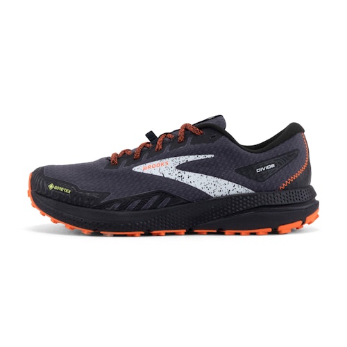 Brooks Divide 4 GTX is the trail shoe you need for all your on- and off-road adventures. A hybrid trail shoe with extra cushioning for paved roads and a grippy sole for off-road excursions! Don't let any obstacle stop you with this reliable trail shoe! MidsoleThe Divide 4 GTX has the DNA LOFT v2 foam, the foam that adapts to your running style. The foam is extremely light and Brooks has found the right balance between the right amount of air and rubber in the foam. The result is a responsive foam with good cushioning that ensures a smooth transition from heel to toe.UpperWith the Divide upper you'll be ready for your next trail adventure. The upper has a mesh upper that has a ventilating function and provides an attractive appearance. The Toe Protector provides protection against bumps and sharp obstacles. In addition to the extra protection at the toes, the upper also has a Gore-Tex® membrane and a transparent mudguard to protect you against rain and mud while keeping your feet cool. With the Divide upper you'll be ready for your next trail adventure. The mesh upper is comfortable and has the additional advantage that it has a ventilating function. The reinforcement at the toes protects your feet against bumps and sharp obstacles. Regardless of the planned adventure, the shoe will be protected against rain and mud by the Gore-Tex® membrane. The bottom of the heel is reinforced while the top of the heel counter remains flexible, soft and comfortable. The advantage of this is that it does not create pressure on your heel bone. The pleated tongue of this shoe is connected to the upper on both sides, preventing dirt from entering the shoe and keeping the tongue centered. OutsoleThe outsole of this model makes you trail-ready. The shoe has a TrailTack rubber outsole and this outsole technology from Brooks provides excellent traction uphill and downhill. In addition, TrailTack ensures optimal grip on slippery paths. A Segmented Crash Pad is also integrated into the outsole. It contributes to shock absorption and stimulates a smooth and natural transition. This together creates a responsive and energetic feeling. Complete your trail experience with the Brooks Divide 4 GTX trail shoe!