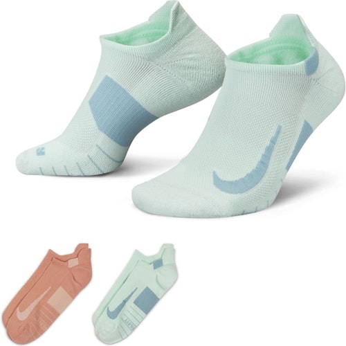 The Nike Multiplier No-show Socks 2-pack are two pairs of unisex running socks. The socks are made of comfortable Dri-Fit material, which keeps your feet cool and dry during your run. This running sock provides support around the arch at the midfoot. The Nike Multiplier no-show has a low fit and you can't see it above your shoes.