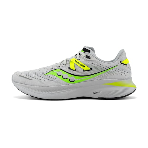 The Saucony Guide 16 is an anti-pronation all-round running shoe that is perfect for your daily run. Whether you're going for a faster 5 km or a longer endurance run; the Guide can do it all. The shoe is suitable for both novice and experienced runners. Experience the perfect balance between cushioning and responsiveness with this all-round running shoe! MidsoleThe PWRRUN cushioning material provides good cushioning and energy return and a super comfortable feeling under the foot. Hollow-Tech is a correction block in the midsole and provides the right support under the foot, while the material is light and minimalistic. Due to the deeper contours in the midsole you get a nicer fit with a supportive feeling for the feet. You can also wear the Guide extra comfortably thanks to the PWRRUN+ insole. The insole provides an extra layer of cushioning. UpperThe upper of the Guide is made with FORMFIT technology, which allows the upper to work together with the footbed and the walls of the midsole. In this way, the foot sinks into the running shoe, as it were, which gives a good lockdown feeling and the necessary stability. The upper is made of mesh which provides extra ventilation and comfort. OutsoleWith a rubber outsole, the shoe provides good grip and traction while running. The Saucony Guide 16 will help you reach your goals!